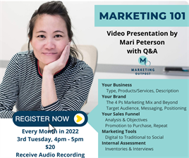 Most businesses focus on the marketing tools, skipping over important areas of your business that end up costing you time and money. This overview will cover the 5 main areas of your business's marketing so you choose the right tools and budget to achieve your goals.About the Zoominar: In this one hour live video presentation, Mari will present an overview of the 5 stages of marketing every business should know. Participants will have time to ask questions and will receive access to the audio recording following the presentation.